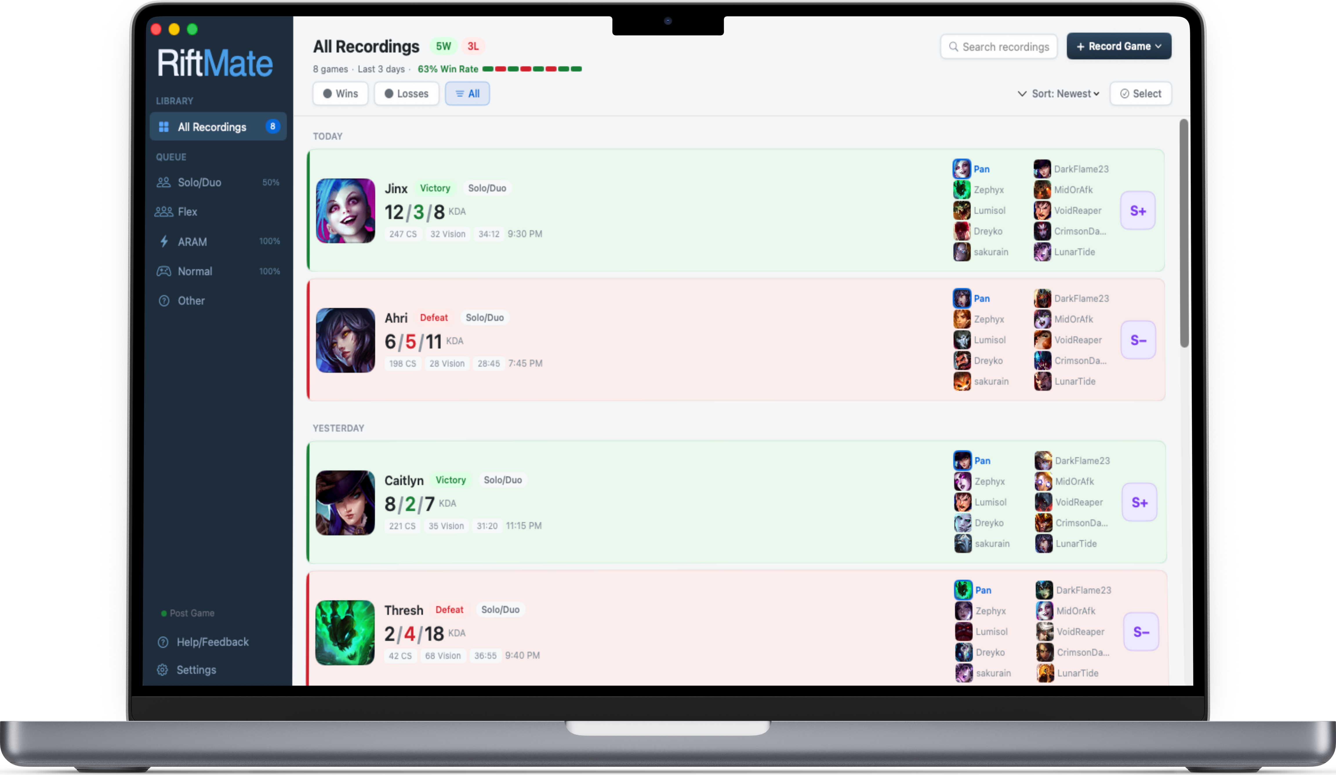 RiftMate detects when you enter champion select and starts capturing in the background. Stops when the game ends. No hotkeys, no OBS, no fiddling with bit-rates.